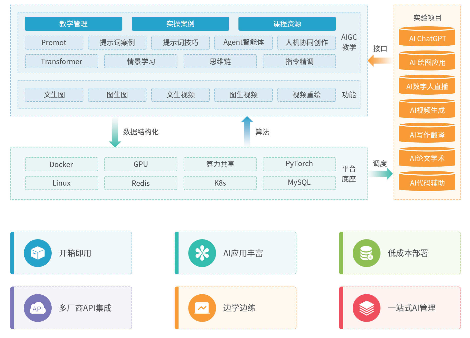 AIGC通识教育平台以AI大模型的应用技巧为核心,旨在培养学生具备专业的AI思维。该平台优化了GPU、CPU计算资源调度技术,使学生能够轻松使用超过20种热门的AI应用,并能熟练掌握它们的使用技巧。平台还内置了丰富的AI通识课程和详尽的实操案例,支持学生自主学习并完成课程内容。